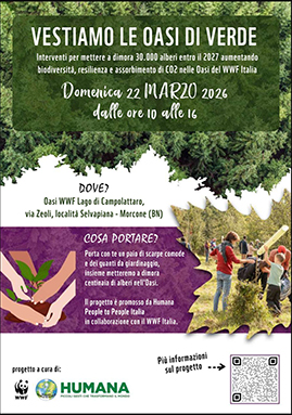 Si svolgerà sabato 21 e domenica 22 marzo prossimi all'Oasi Wwf lago di Campolattaro l'evento "Vestiamo le Oasi di verde", il progetto che unisce le forze di Humana People to People Italia e Wwf Italia per rendere le Oasi del Wwf ancora più verdi.