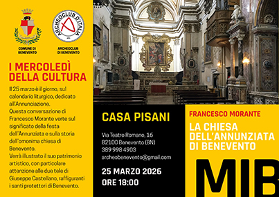 Si partirà il prossimo 25 marzo, giorno che sul calendario liturgico è dedicato all'Annunziata, con una conversazione di Francesco Morante sulla chiesa dell'Annunziata di Benevento e sul suo patrimonio artistico, in particolare sulle due tele del Castellano raffiguranti i santi protettori di Benevento.