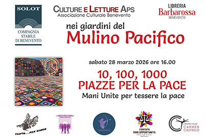 Come in molte piazze d'Italia anche a Benevento domani, sabato 28 marzo, si terrà nei Giardini del Teatro Mulino Pacifico a via Appio Claudio, dalle 16.00 alle 20.00, la manifestazione "10, 100, 1000 Piazze per la Pace" - mani unite per tessere la Pace.