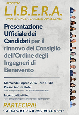 Domani, mercoledì 8 aprile, alle 18.30, all'Antum Hotel, si terrà la presentazione della compagine Libera, candidato presidente Ivan Verlingieri, per il rinnovo del Consiglio dell'Ordine degli Ingegneri di Benevento per il quadriennio 2026-2030.