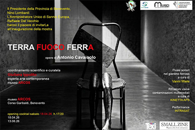 Sabato 18 aprile, dalle 17.00 alle 20.00, apertura del progetto "Arcos Open" a cura di Giuliana Ippolito, esperta di arti contemporanee del Museo Arcos, con la mostra dal titolo: "Terra, fuoco, ferra", opere di Antonio Cavaiuolo a cura di Giuliana Ippolito.