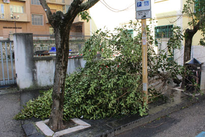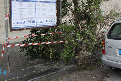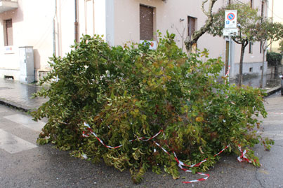 Le folate di queste ore hanno abbattuto molti alberi lungo viale Mellusi, licustri che non hanno retto in quanto hanno ancora le chiome folte non essendo state potate da anni (la Polizia Municipale ha evidenziato con nastro rosso e bianco la zona pericolosa nei pressi degli alberi caduti e vicino al palo della pubblica illuminazione).