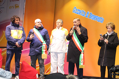Una volta che Mazzone ha acceso il tripode sul palco è stato invitato a salire il sindaco Clemente Mastella, l'unico ammesso a salire da parte dell'organizzazione ci è stato riferito, ma Mastella, di sua iniziativa, appena giunto sul palco, ha chiamato a sé il prefetto Moscarella, il presidente della Provincia, Lombardi ed un gruppo di sindaci.