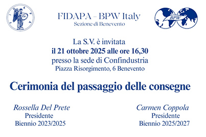 Cerimonia del passaggio delle consegne alla Fidapa Bpw Italy, Sezione di BeneventoSi terra' martedi' prossimo, 21 ottobre tra la presidente uscente Rossella Del Prete e quella eletta Carmen CoppolaRedazionen.173774 ven 17-10-2025 14:44